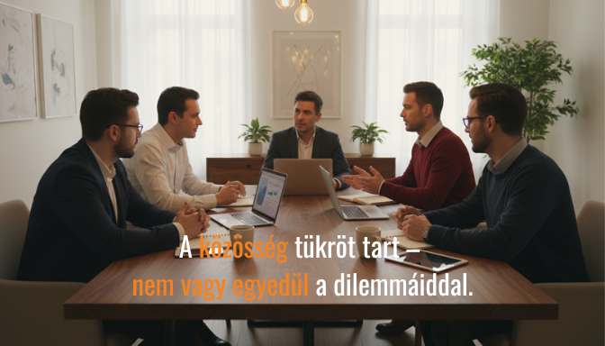 Ez azért ennyire kritikus pont, mert fejben ilyenkor váltasz magányos harcosból közösségi játékossá. Amíg egyedül őrlődsz a kérdéseiden, könnyű azt hinni, hogy „ezzel csak én küzdök”, vagy hogy „biztos velem van a baj”. Amint viszont beülsz egy mastermind‑csoportba, csatlakozol egy vállalkozói közösséghez, és leülsz beszélgetni olyanokkal, akik már előtted járnak, hirtelen kiderül: ezek tipikus vállalkozói dilemmák, nem személyes kudarcok.